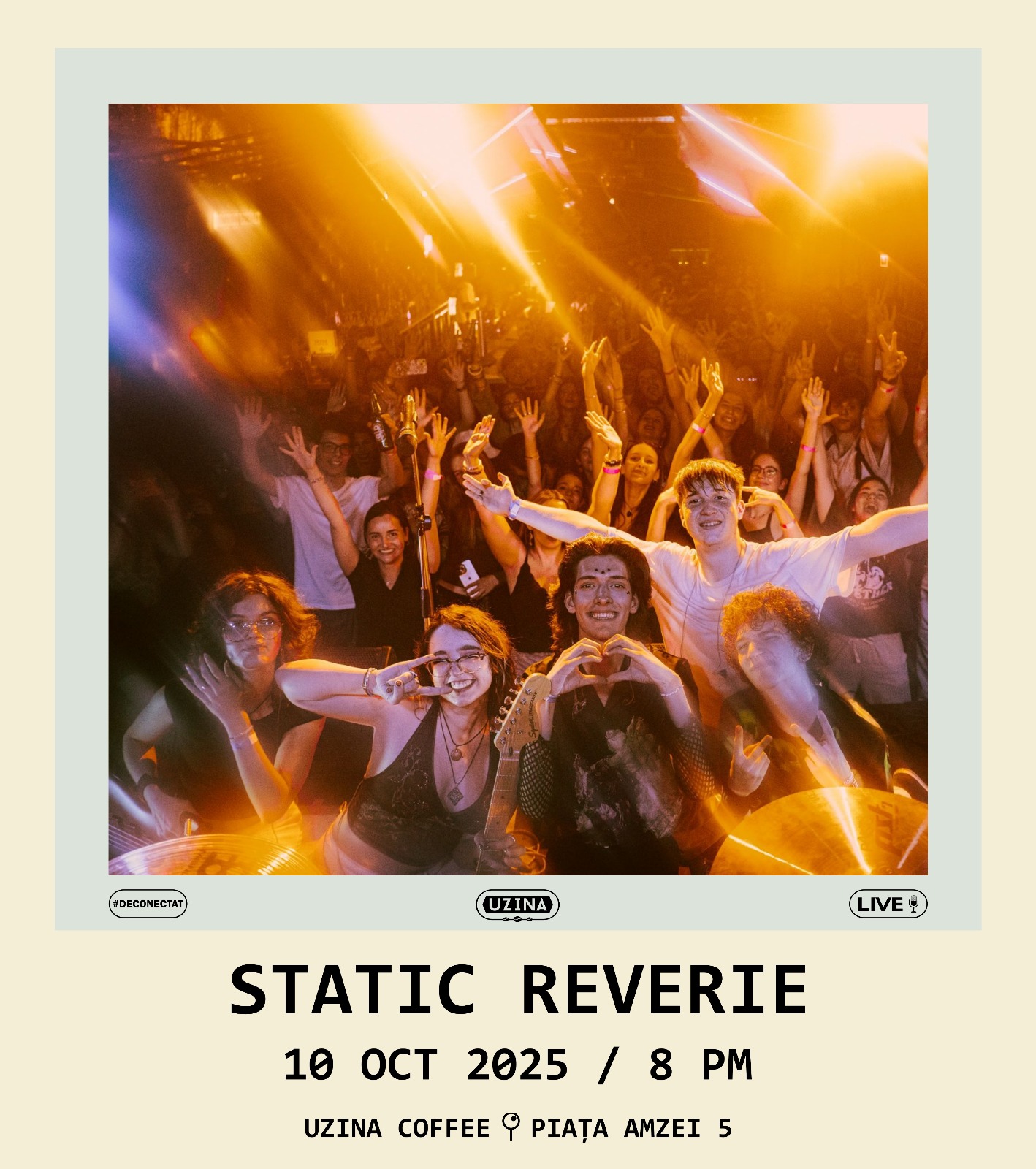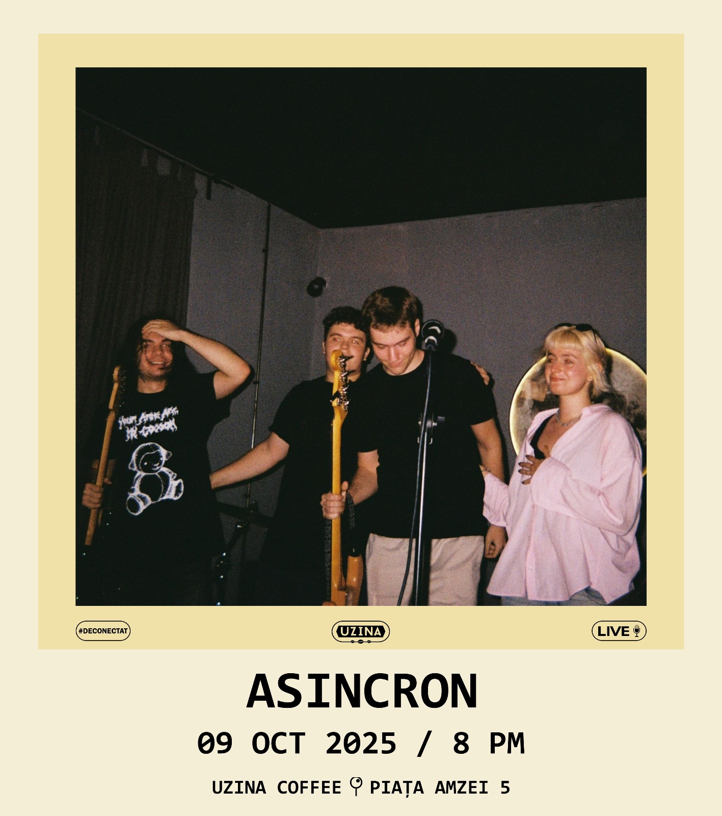 📅 Joi, 09 Octombrie 🕘 20:00 📍 UZINA COFFEE – str. Piata Amzei 5, București 🎟️ Artist Support: 40 lei 👉 Accesul la eveniment se face pe bază de rezervare, confirmată pe email. 👉 Email rezervări: contact@uzinacoffee.ro 👉 Întrucât numărul de locuri este limitat, vă rugăm